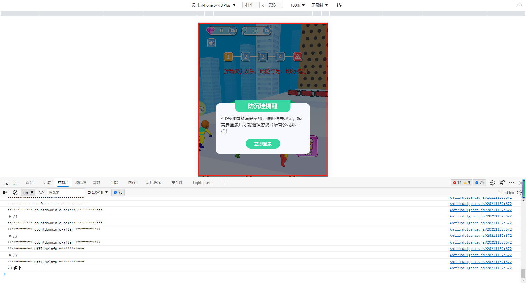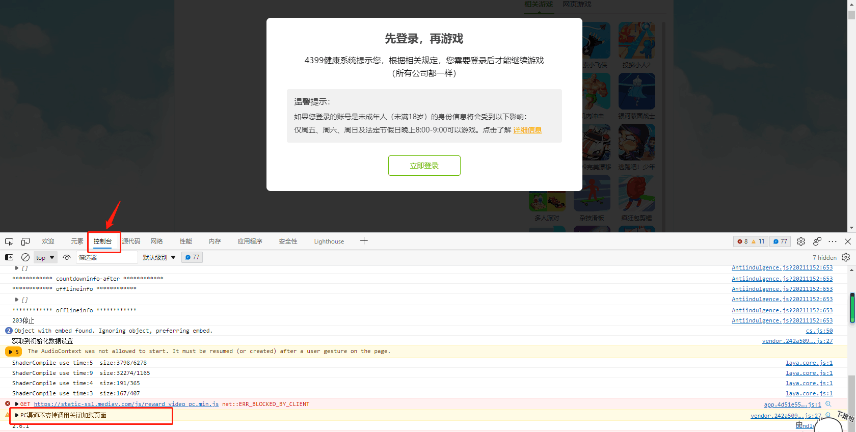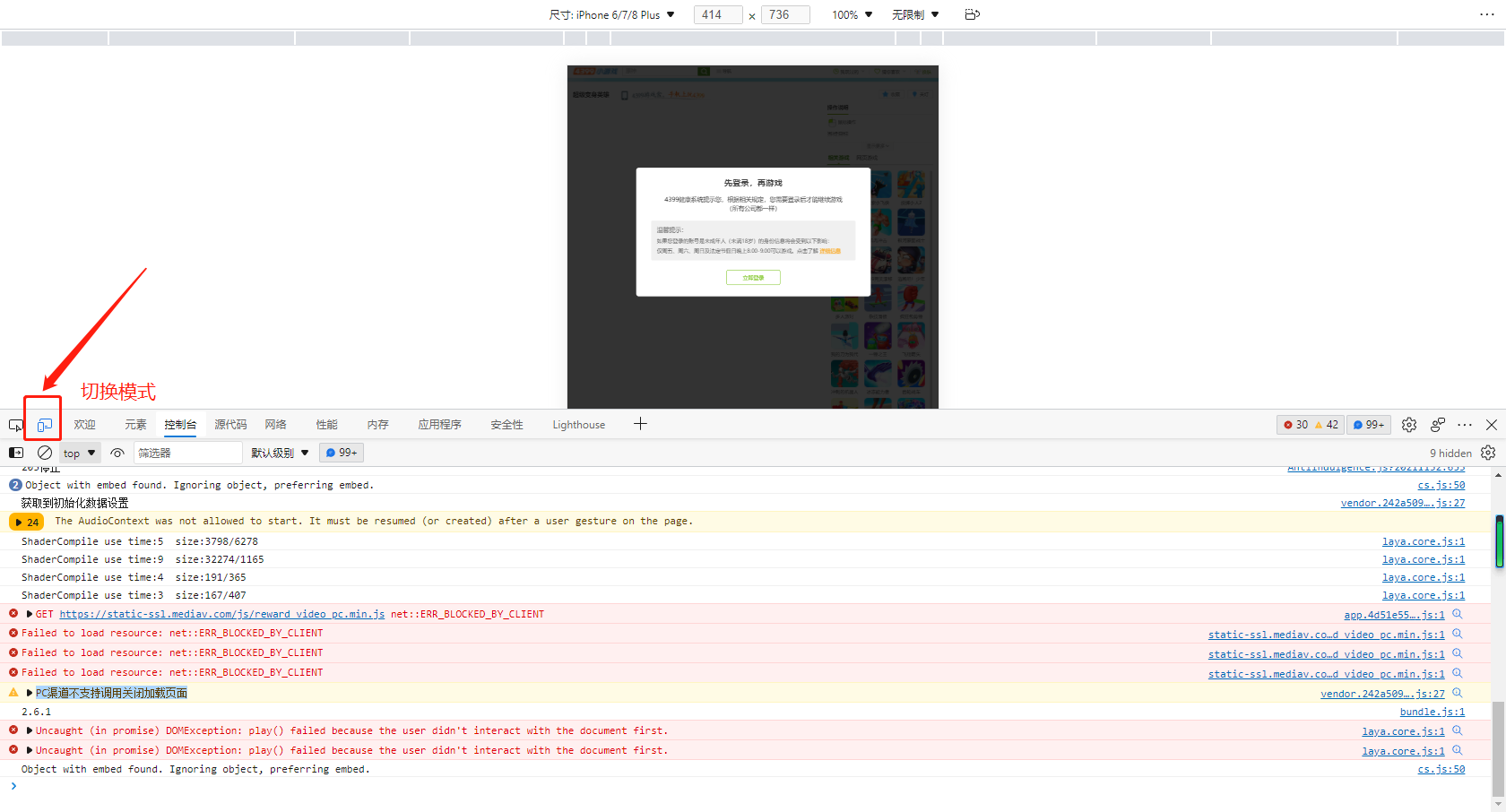 控制台查看是否有这样一句话PC渠道不支持调用关闭加载页面,这说明不能用网页的方式来加载,需要我们换成手机模式,如果没有可滤过此步骤